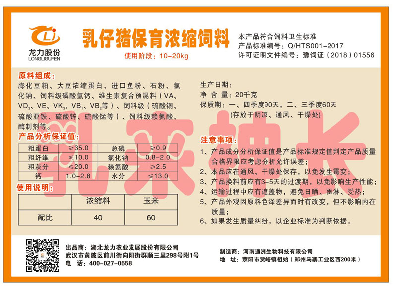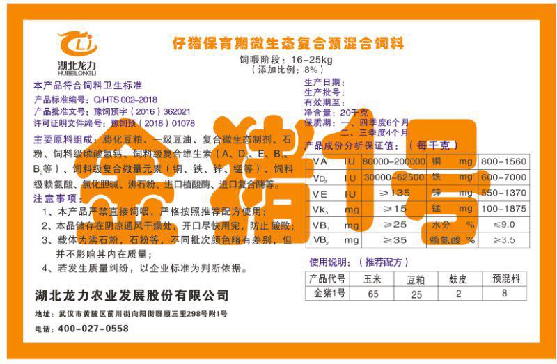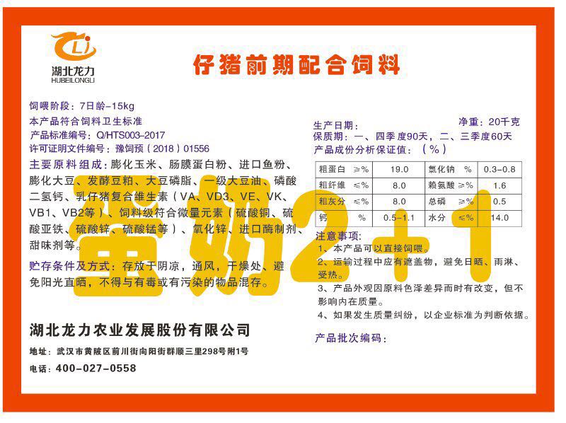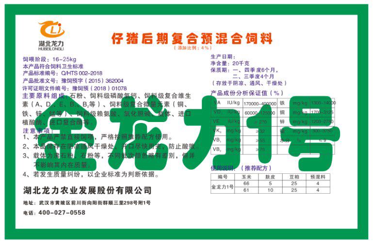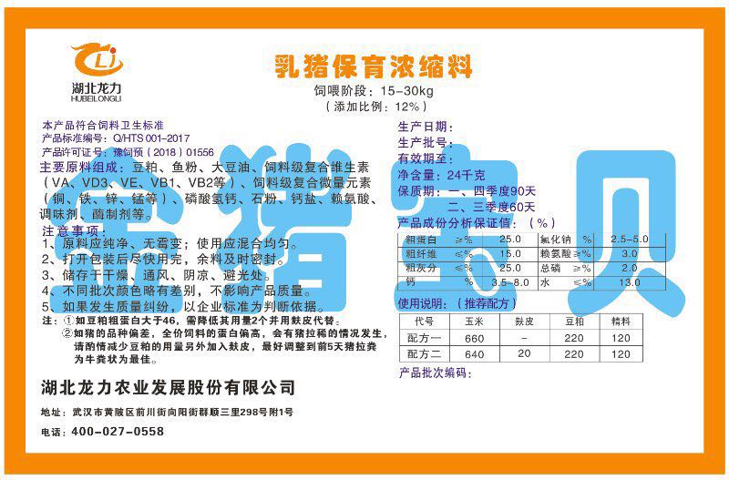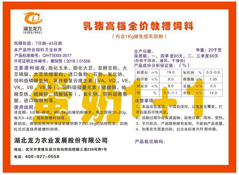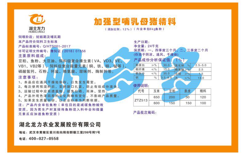 湖北龍力農(nóng)業(yè)發(fā)展股份有限公司坐落于武漢市黃陂區(qū)前川街向陽街群順三里298號附1號。公司成立于2014年6月,公司自成立以來把“創(chuàng)全球最大養(yǎng)豬綜合服務(wù)”為企業(yè)愿景。致力于打造教保料品牌”作為公司發(fā)展的明確目標。公司一直致力于豬營養(yǎng)的研究和開發(fā),積極與國內(nèi)外高校和科研機構(gòu)合作,推廣養(yǎng)豬技術(shù)、動物營養(yǎng)新概念,向世界農(nóng)牧企業(yè)學(xué)習與合作。公司采用國內(nèi)先進的生產(chǎn)工藝,選擇高精度電子配料秤,高均勻度、無殘留混合機等先進設(shè)備....